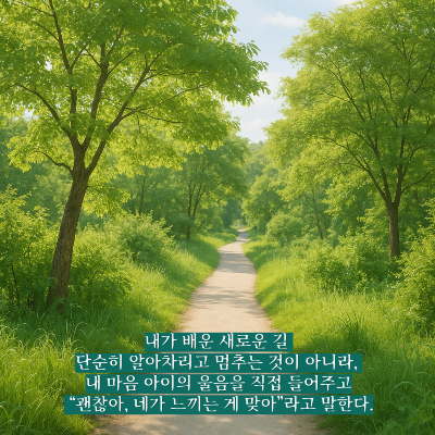 마음을 몰라서 고생했던 시간은 길었다. 그러나 그것이 치유의 출발점이 되었다. 체험과 이론이 만나면서 내 마음의 길이 조금씩 보이기 시작했다. 오늘 하루, 올라오는 감정을 억누르지 말고 따뜻하게 바라보자. 그 순간 마음 아이는 “이제 나를 봐주는구나” 하고 미소 지을 것이다. 그것이 치유의 시작이다.